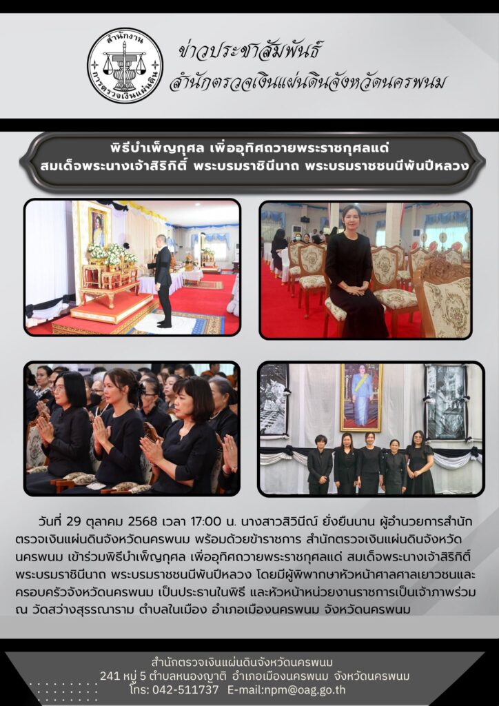 ผู้อำนวยการสำนักตรวจเงินแผ่นดินจังหวัดนครพนม พร้อมด้วยข้าราชการ เข้าร่วมพิธีบำเพ็ญกุศล เพื่ออุทิศถวายพระราชกุศลแด่ สมเด็จพระนางเจ้าสิริกิต์ พระบรมราชินีนาถ พระบรมราชชนนีพันปีหลวงงานราชพิธี/รัฐพิธีตุลาคม 30, 2025ตุลาคม 30, 2025 Post Views: 110