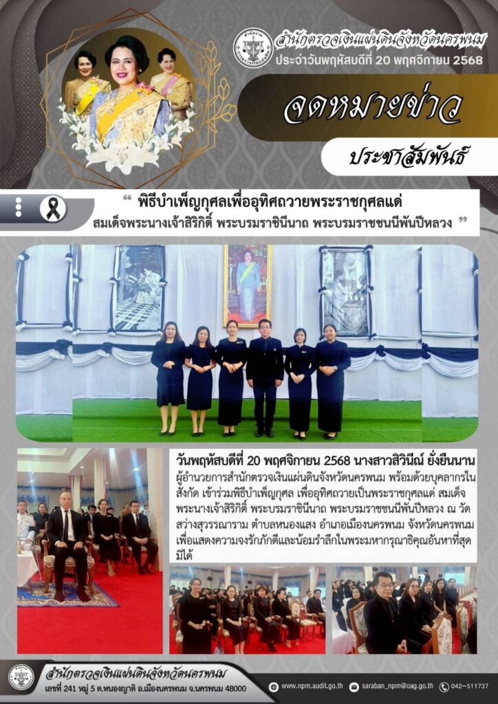 ผู้อำนวยการสำนักตรวจเงินแผ่นดินจังหวัดนครพนม พร้อมด้วยข้าราชการ เข้าร่วมพิธีบำเพ็ญกุศล เพื่ออุทิศถวายพระราชกุศลแด่ สมเด็จพระนางเจ้าสิริกิต์ พระบรมราชินีนาถ พระบรมราชชนนีพันปีหลวง ณ วัดสว่างสุวรรณาราม ตำบลในเมือง อำเภอเมือง จังหวัดนครพนมงานราชพิธี/รัฐพิธี, ภาพกิจกรรมพฤศจิกายน 21, 2025พฤศจิกายน 21, 2025 Post Views: 129