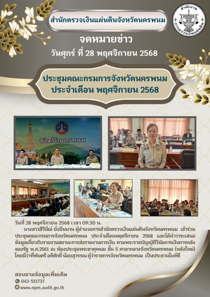 ผู้อำนวยการสำนักตรวจเงินแผ่นดินจังหวัดนครพนม เข้าร่วมประชุมคณะกรมการจังหวัดนครพนม ประจำเดือนพฤศจิกายน 2568กิจกรรมอื่น ๆ, ภาพกิจกรรมพฤศจิกายน 28, 2025พฤศจิกายน 28, 2025 Post Views: 113