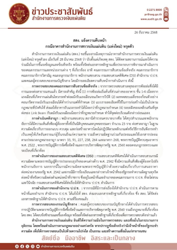 สตง.แจ้งความคืบหน้า กรณีอาคารสำนักงานการตรวจเงินแผ่นดิน (แห่งใหม่) ทรุดตัวข่าวที่น่าสนใจ, ข่าวประชาสัมพันธ์ธันวาคม 28, 2025ธันวาคม 28, 2025 Post Views: 92
