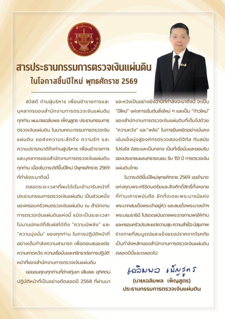 สารประธานกรรมการตรวจเงินแผ่นดิน ในโอกาสขึ้นปีใหม่ พุทธศักราช 2569ข่าวที่น่าสนใจ, ข่าวประชาสัมพันธ์มกราคม 3, 2026 Post Views: 90