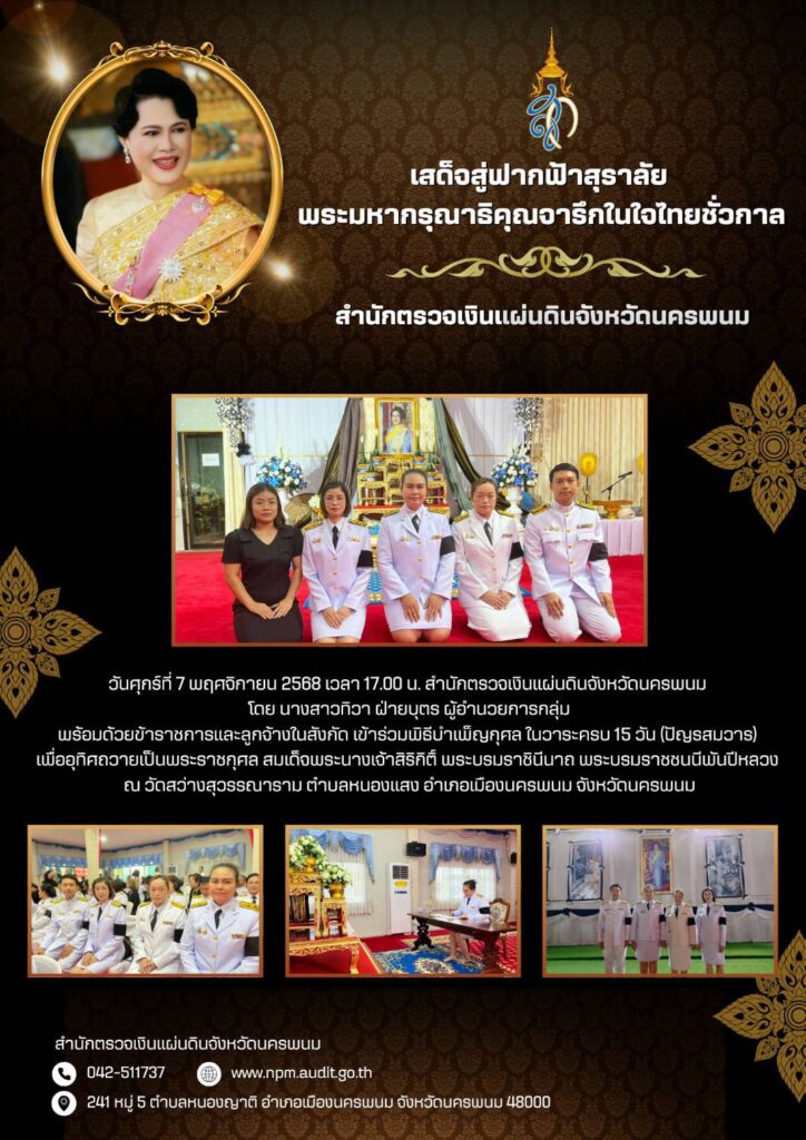 สำนักตรวจเงินแผ่นดินจังหวัดนครพนม เข้าร่วมพิธีบำเพ็ญกุศลในวาระครบ 15 วัน (ปัญรสมวาร) เพื่ออุทิศถวายเป็นพระราชกุศล สมเด็จพระนางเจ้าสิริกิต์ พระบรมราชินีนาถ พระบรมราชชนนีพระพันปีหลวงงานราชพิธี/รัฐพิธี, ภาพกิจกรรมพฤศจิกายน 7, 2025พฤศจิกายน 7, 2025 Post Views: 106