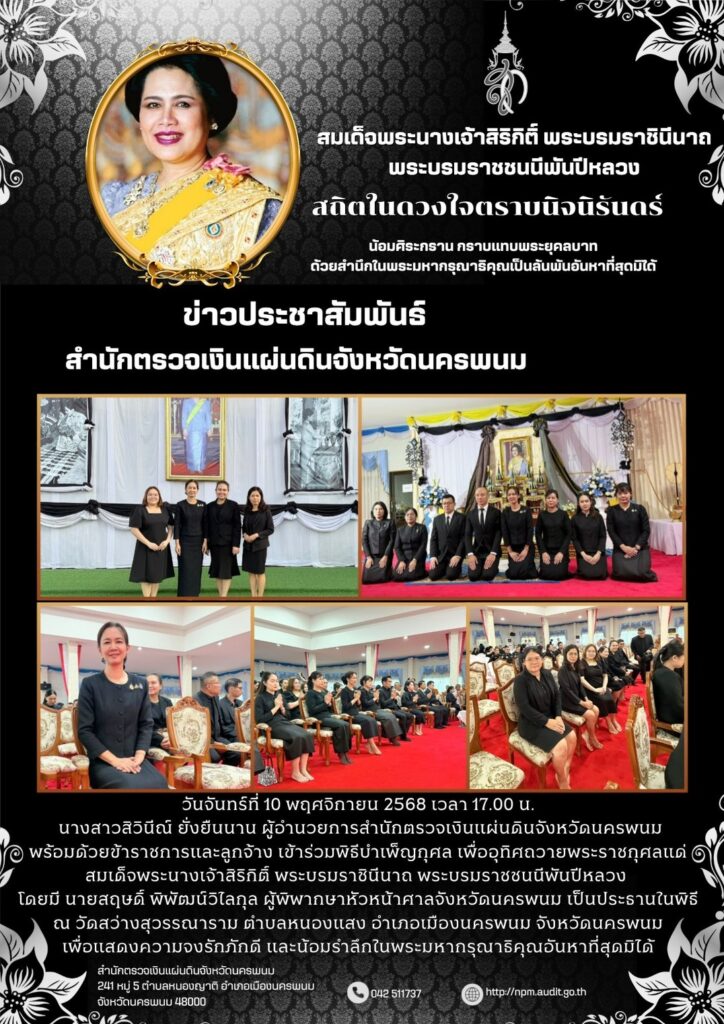 สำนักตรวจเงินแผ่นดินจังหวัดนครพนม เข้าร่วมพิธีบำเพ็ญกุศล เพื่ออุทิศถวายพระราชกุศลแด่ สมเด็จพระนางเจ้าสิริกิต์ พระบรมราชินีนาถ พระบรมราชชนนีพันปีหลวง ณ วัดสว่างสุวรรณาราม ตำบลในเมือง อำเภอเมือง จังหวัดนครพนมงานราชพิธี/รัฐพิธี, ภาพกิจกรรมพฤศจิกายน 10, 2025 Post Views: 232