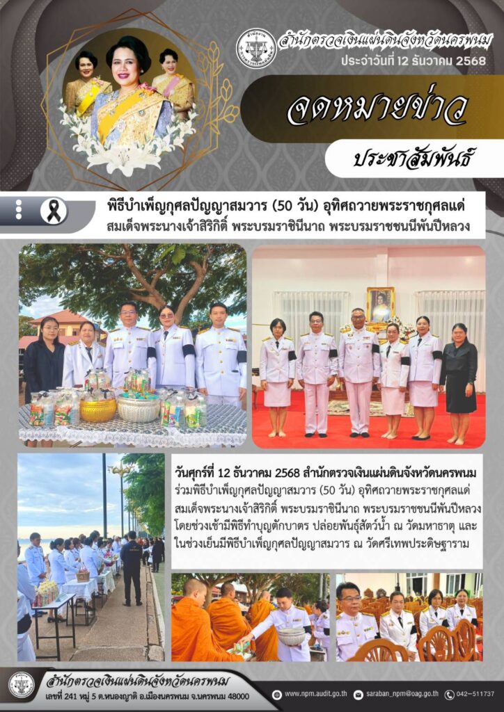 สำนักตรวจเงินแผ่นดินจังหวัดนครพนม เข้าร่วมพิธีบำเพ็ญกุศลปัญญาสมวาร (50 วัน) อุทิศถวายพระราชกุศลแด่สมเด็จพระนางเจ้าสิริกิต์ พระบรมราชินีนาถ พระบรมราชชนนีพันปีหลวงงานราชพิธี/รัฐพิธี, ภาพกิจกรรมธันวาคม 12, 2025ธันวาคม 12, 2025 Post Views: 95