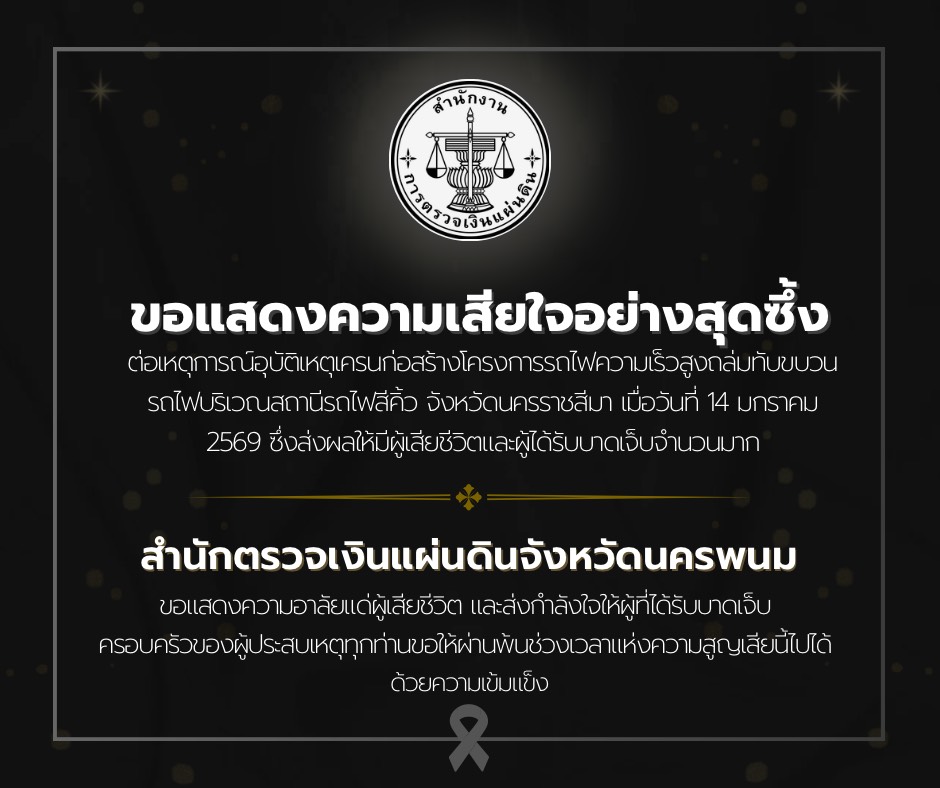 สำนักตรวจเงินแผ่นดินจังหวัดนครพนม ขอแสดงความเสียใจอย่างสุดซึ้ง ต่อเหตุการณ์เครนก่อสร้างโครงการรถไฟความเร็วสูงถล่มทับขบวนรถไฟบริเวณสถานีรถไฟสีคิ้ว จังหวัดนครราชสีมา เมื่อวันที่ 14 มกราคม 2569ข่าวที่น่าสนใจ, ข่าวประชาสัมพันธ์มกราคม 14, 2026มกราคม 14, 2026 Post Views: 82