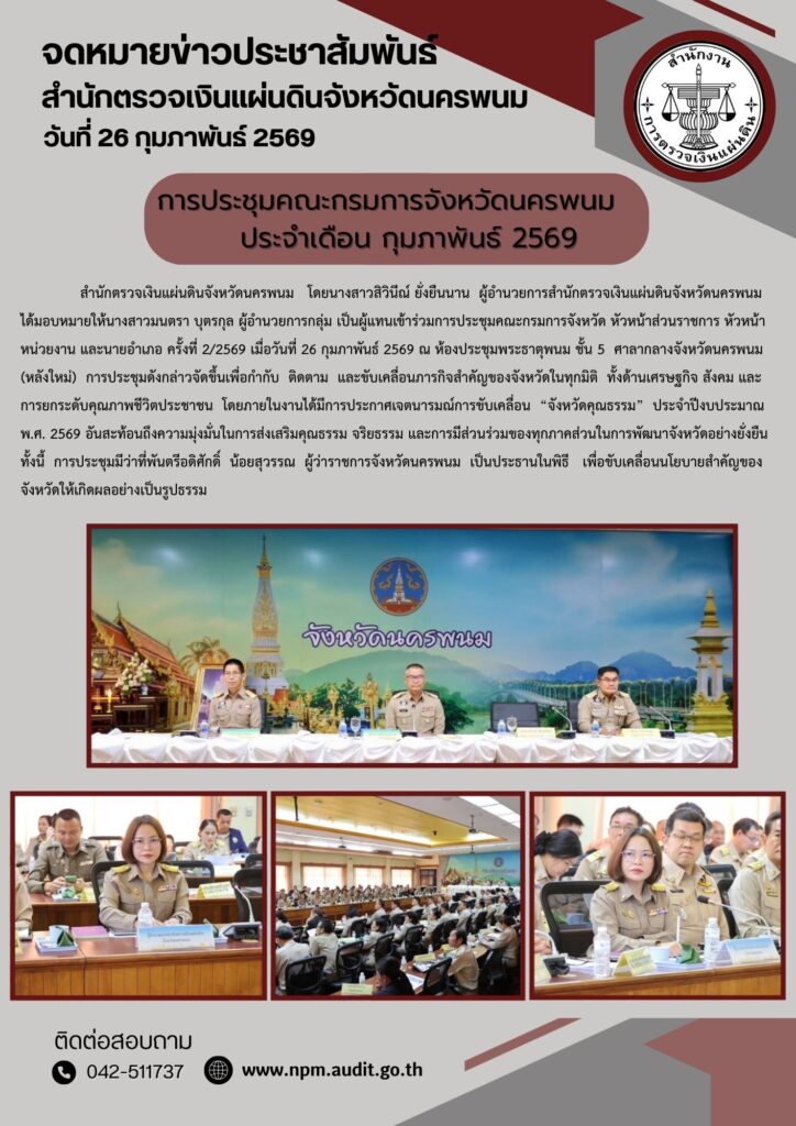 สำนักตรวจเงินแผ่นดินจังหวัดนครพนม เข้าร่วมประชุมคณะกรมการจังหวัดนครพนม ประจำเดือนกุมภาพันธ์ 2569กิจกรรมอื่น ๆ, ภาพกิจกรรมกุมภาพันธ์ 27, 2026กุมภาพันธ์ 27, 2026 Post Views: 22