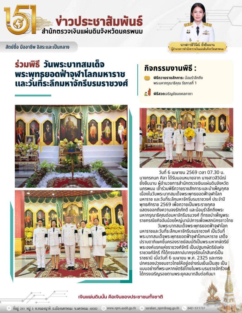 สำนักตรวจเงินแผ่นดินจังหวัดนครพนม เข้าร่วมพิธีวันพระบาทสมเด็จพระพุทธยอดฟ้าจุฬาโลกมหาราชและวันที่ระลึกมหาจักรีบรมราชวงศ์งานราชพิธี/รัฐพิธี, ภาพกิจกรรมเมษายน 6, 2026เมษายน 6, 2026 Post Views: 22