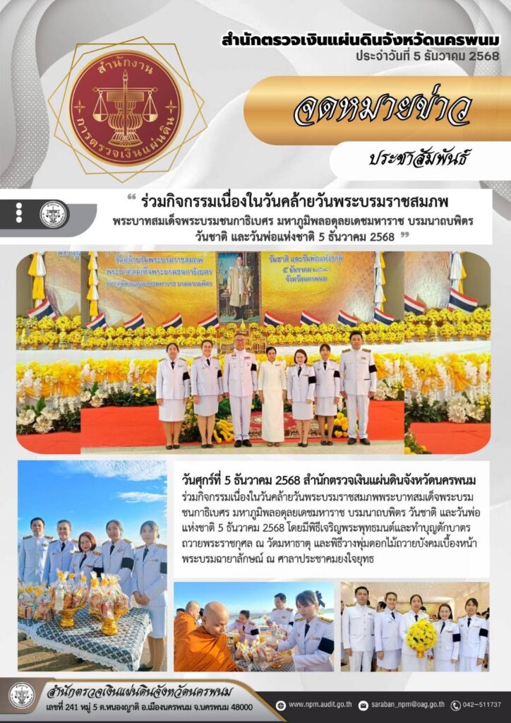 สำนักตรวจเงินแผ่นดิน ร่วมกิจกรรมเนื่องในวันคล้ายวันพระบรมราชสมภพพระบาทสมเด็จพระบรมชนกาธิเบศร มหาภูมิพลอดุลยเดชมหาราช บรมนาถบพิตร วันชาติและวันพ่อแห่งชาติกิจกรรมประชาสัมพันธ์, งานราชพิธี/รัฐพิธีธันวาคม 7, 2025 Post Views: 105
