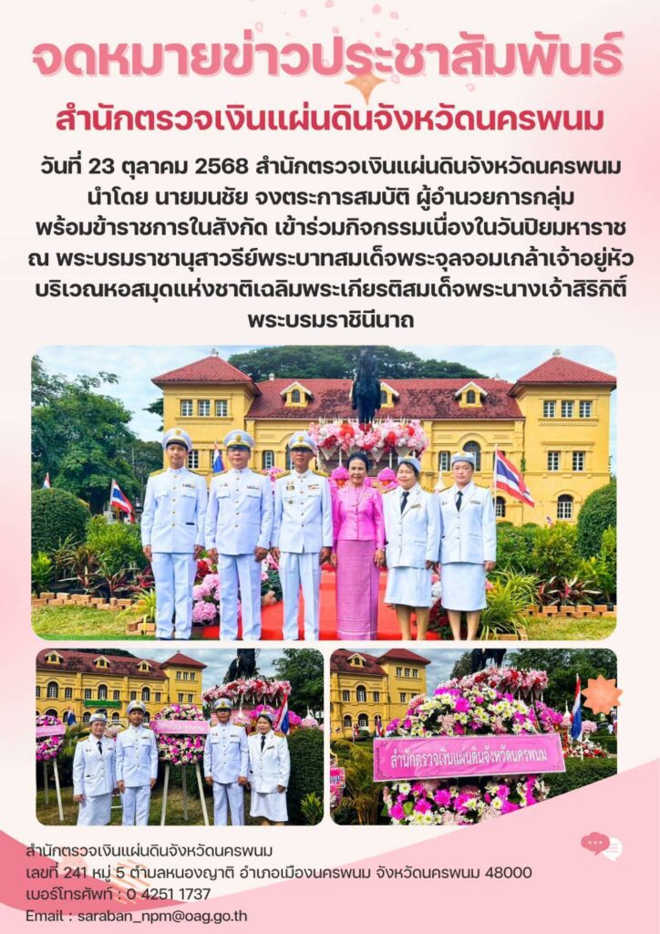 สำนักตรวจเงินแผ่นดินจังหวัดนครพนม ร่วมกิจกรรมเนื่องในวันปิยมหาราชงานราชพิธี/รัฐพิธีตุลาคม 30, 2025ตุลาคม 30, 2025 Post Views: 93