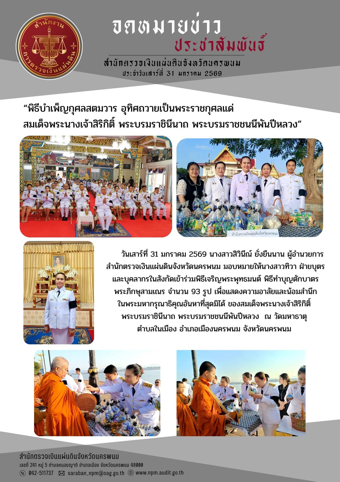 สำนักตรวจเงินแผ่นดินจังหวัดนครพนม ร่วมพิธีบำเพ็ญกุศลสตมวาร อุทิศถวายเป็นพระราชกุศลแด่สมเด็จพระนางเจ้าสิริกิติ์ พระบรมราชินีนาถ พระบรมราชชนนีพันปีหลวง มกราคม 31, 2026