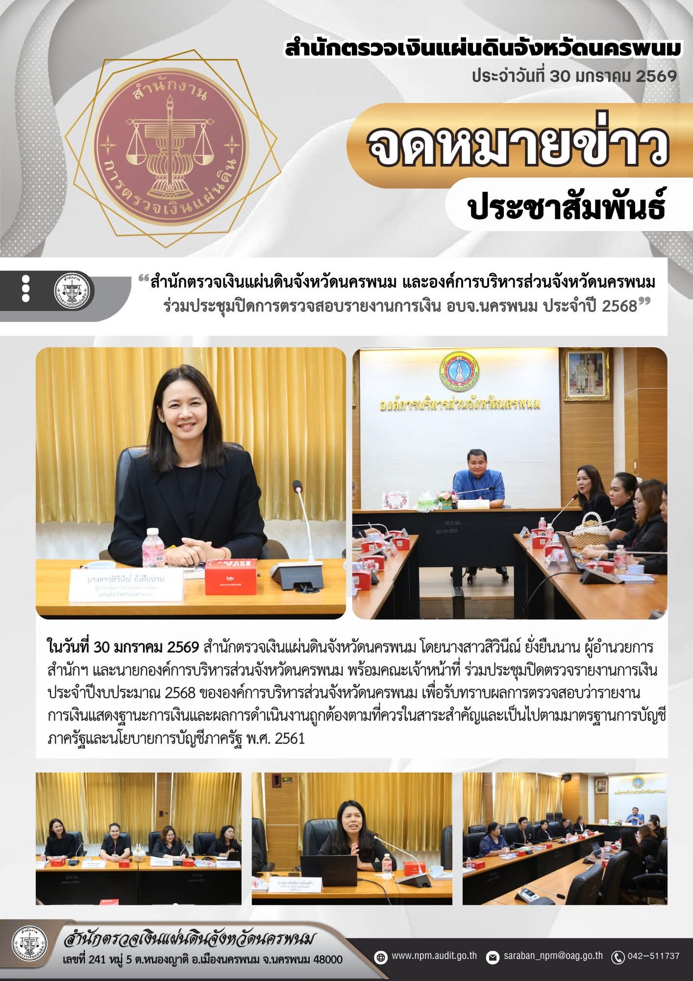 ผู้อำนวยการสำนักตรวจเงินแผ่นดินจังหวัดนครพนม ร่วมประชุมปิดการตรวจสอบรายงานการเงินขององค์การบริหารส่วนจังหวัดนครพนม ประจำปี 2568 มกราคม 31, 2026มกราคม 31, 2026