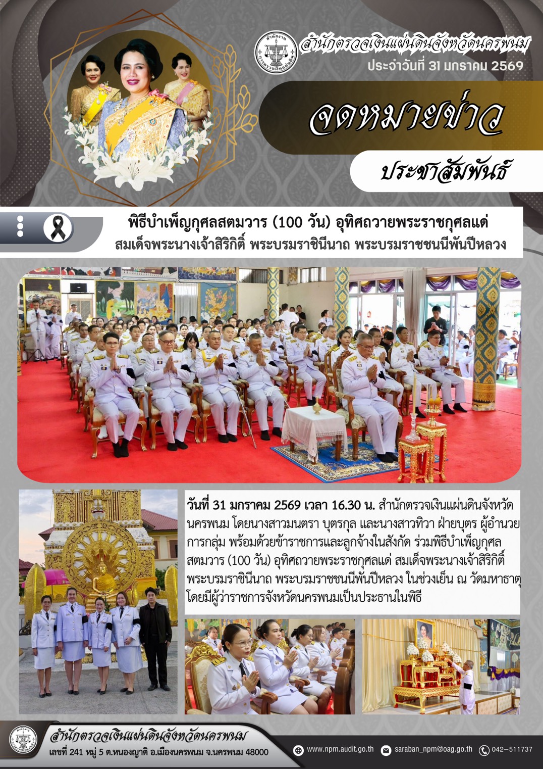 สำนักตรวจเงินแผ่นดินจังหวัดนครพนม เข้าร่วมพิธีบำเพ็ญกุศลสตมวาร (100) วัน อุทิศถวายพระราชกุศลแด่สมเด็จพระนางเจ้าสิริกิต์ พระบรมราชินีนาถ พระบรมราชชนนีพันปีหลวง กุมภาพันธ์ 1, 2026