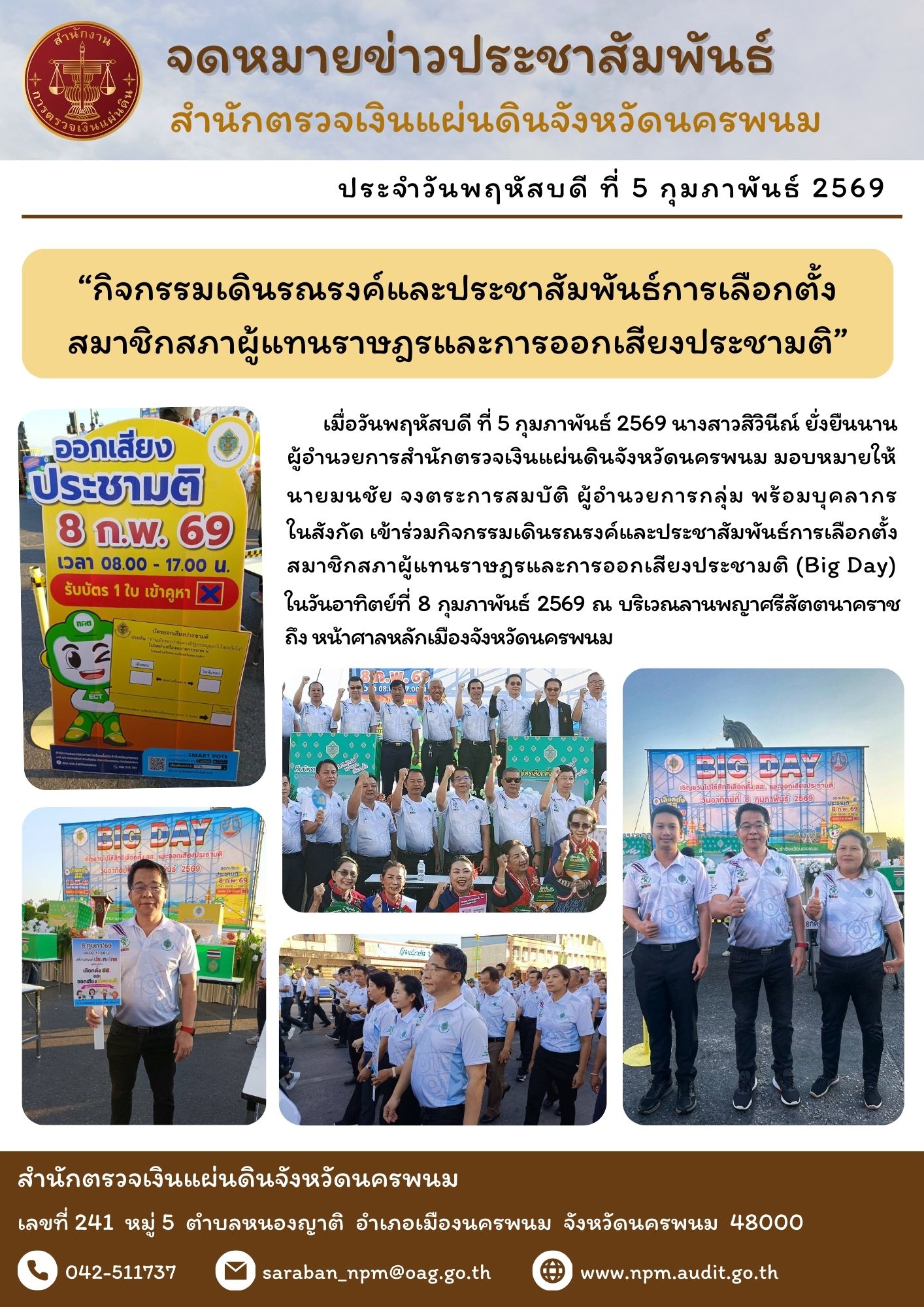 สำนักตรวจเงินแผ่นดินจังหวัดนครพนม เข้าร่วมกิจกรรมเดินรณรงค์และประชาสัมพันธ์การเลือกตั้งสมาชิกสภาผู้แทนราษฎรและการออกเสียงประชามติ กุมภาพันธ์ 5, 2026กุมภาพันธ์ 5, 2026